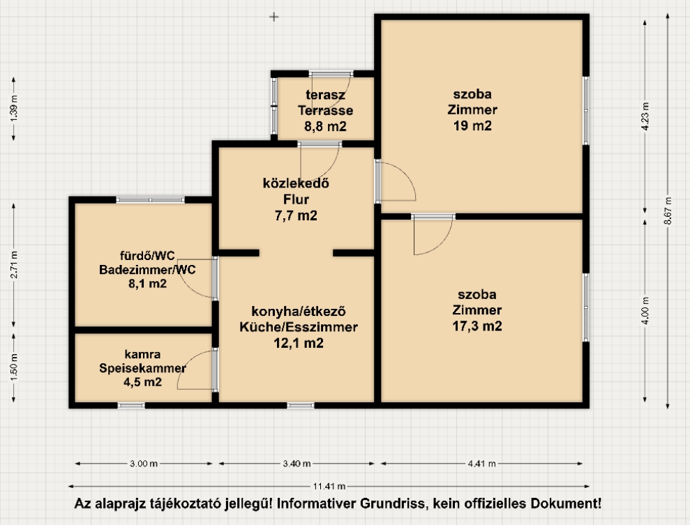 ✅ Az ingatlan elosztása praktikus és jól átgondolt. Két szoba, konyha, étkező, közlekedő, beépített terasz, fürdőszoba és kamra található benne.