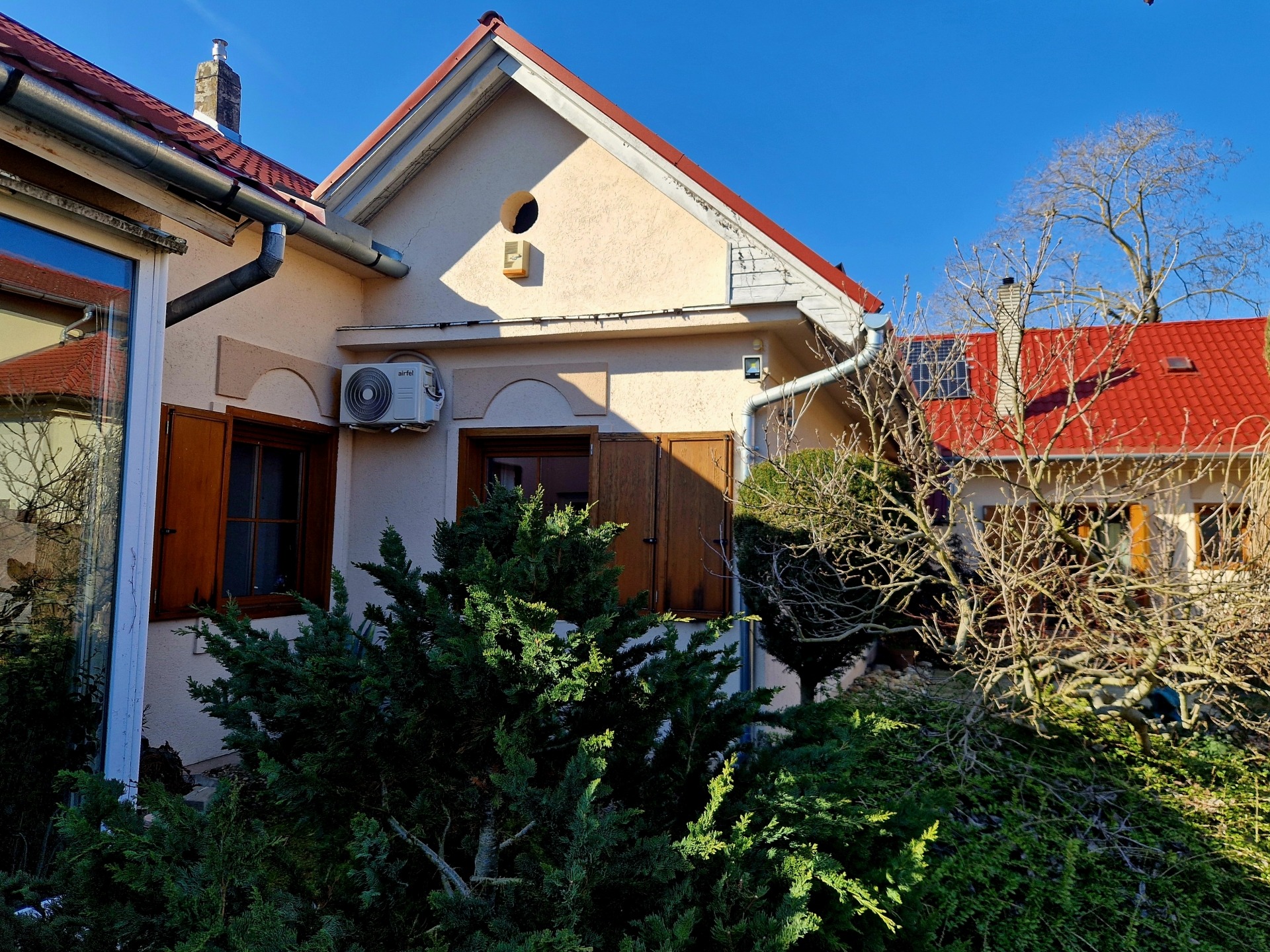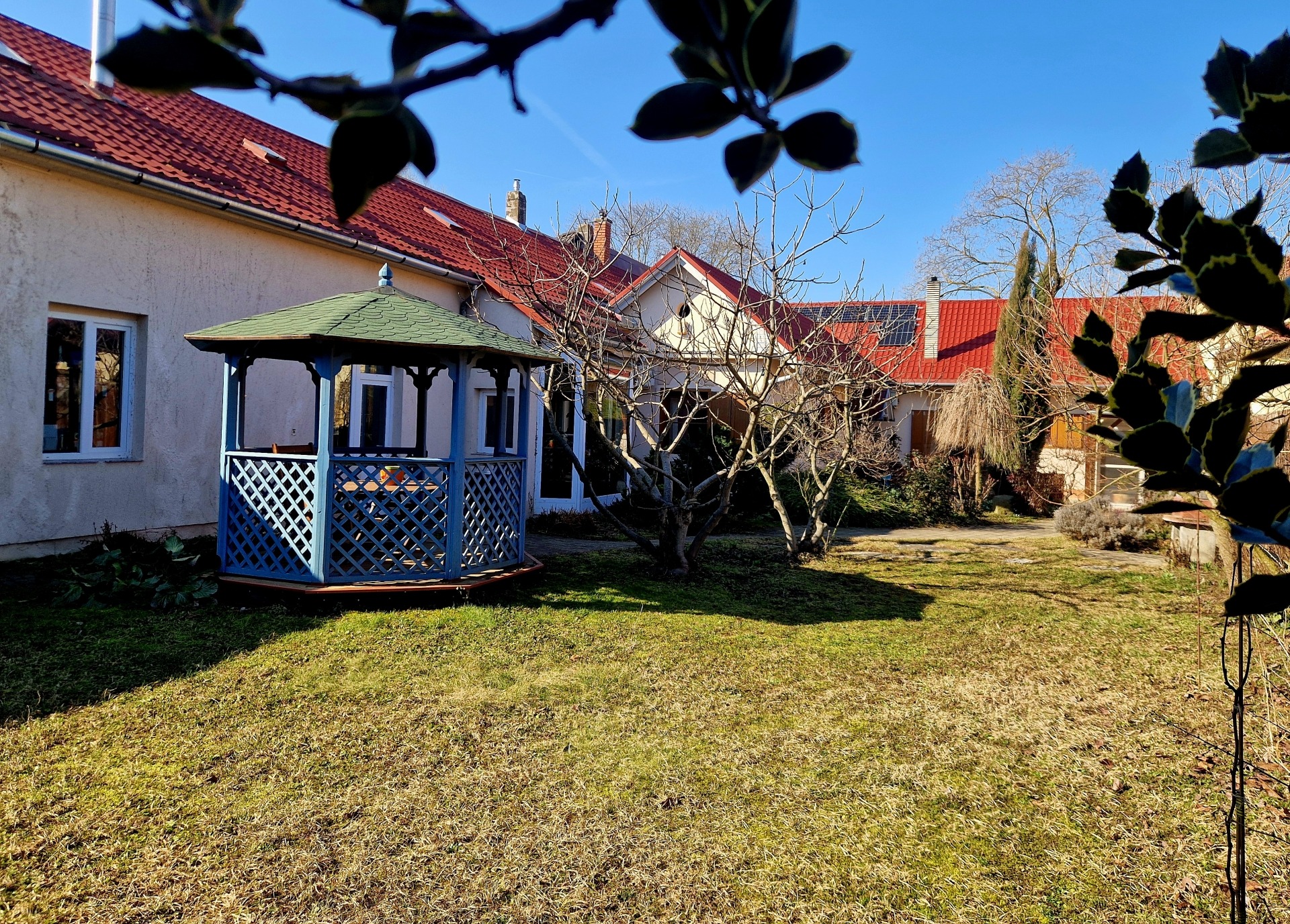 Az ingatlan hasznos alapterülete 195 m2 és teljesen privát, 730 m2 nagyságú telken helyezkedik el, ahova semmilyen irányból nem lehet belátni. A parkosított kert dísznövényekkel beültetett, igényesen kialakított. Kerti kiülő, sütögető és hangulatos filagória szolgálja a pihenést és a baráti összejöveteleket. A kapualjban zárt, fedett autóbeálló található, az udvarban további két fedett beálló biztosított. Műhely és tárolóhelyiségek is rendelkezésre állnak.